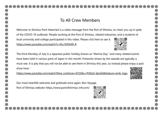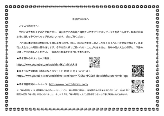 (制作の背景)海の恩恵に感謝し、海洋国日本の繁栄を願う日として、1996年に国民の祝日「海の日」が定められ、7月を「海の月間」として全国各地で様々な行事を実施しております。2020年から、コロナ禍でも海上で活躍する船員の皆様へ「がんばれ」の手作り動画メッセージを配信しています。また、「海の日」月間中は、直接、Emailにて清水港へ寄港する船舶に対し、メッセージを配信しています。emailは、PDFからご覧いただけます